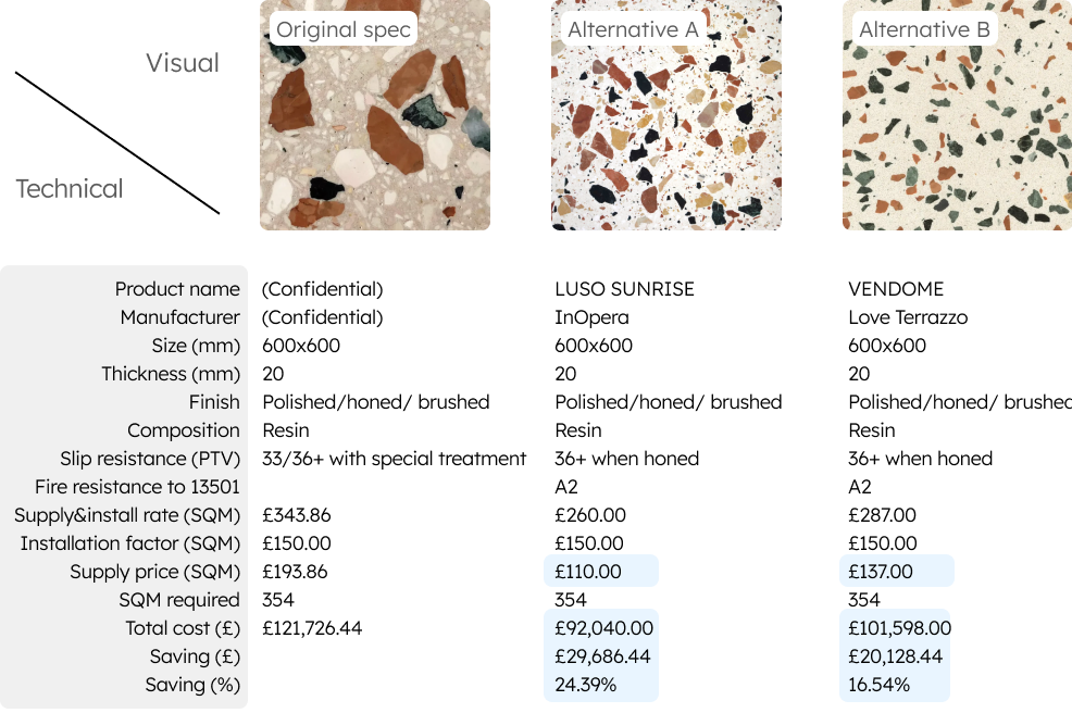 The original specification called for 600×600mm terrazzo tile from a well-known market brand. VE+ presented 5 compliant options from leading UK suppliers, including InOpera, Love Terrazzo, and Mosaic Factory, to identify true like-for-like alternatives. The preferred alternate delivered a £29,686 saving, equivalent to 24.4%, while maintaining the same aesthetic character and performance criteria as the original.